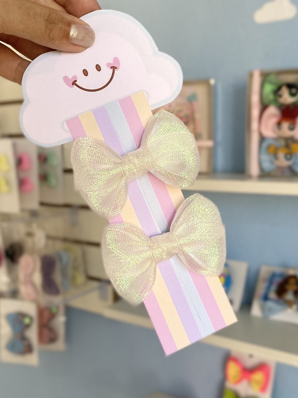 Laço feito de organza holográfica brilhante, no bico de pato semi encapado e com borrachinha antideslizante.